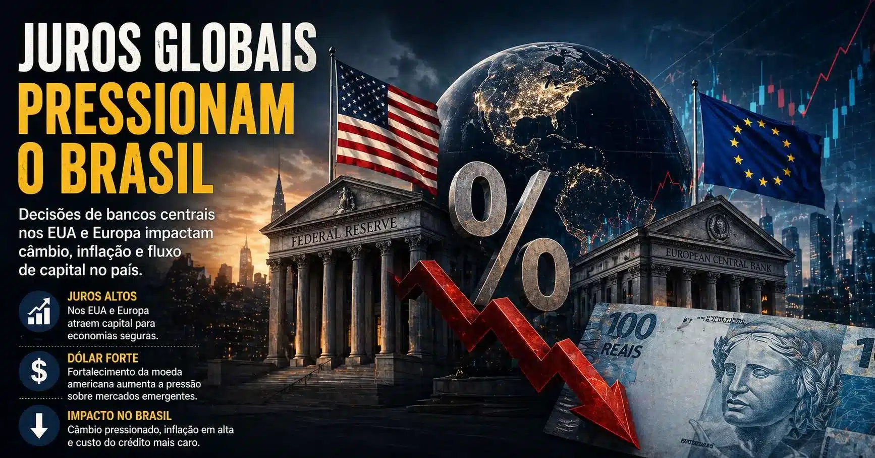 As decisões recentes de bancos centrais nas principais economias do mundo aumentaram a pressão sobre o Brasil. O movimento impacta diretamente o câmbio, o fluxo de capital e o custo do dinheiro no país.